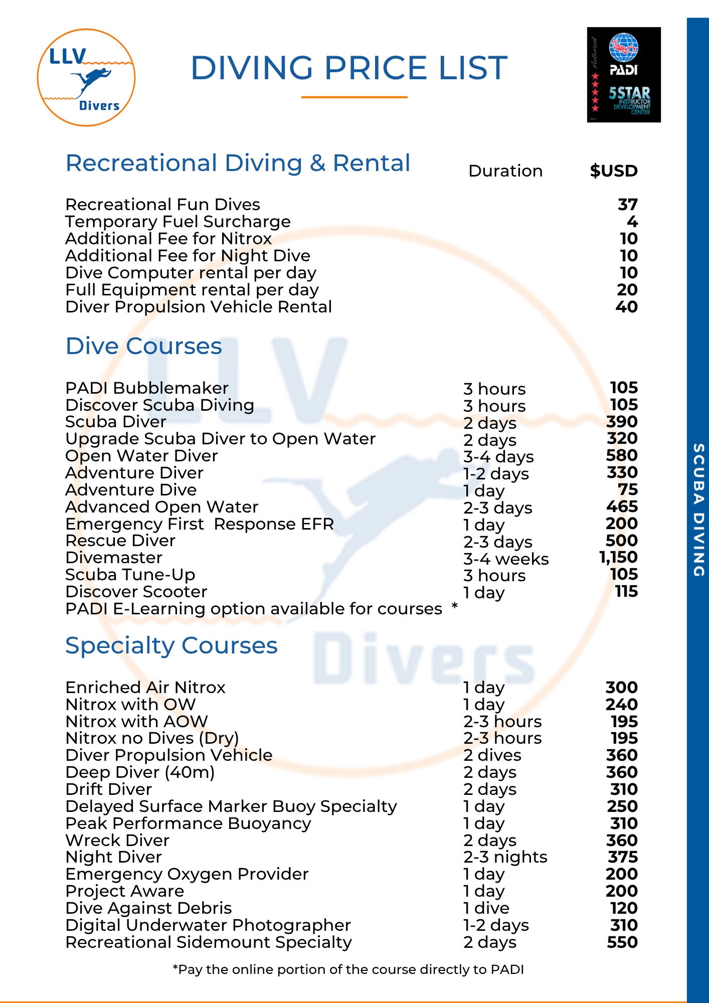 DIVING PRICE LISTS